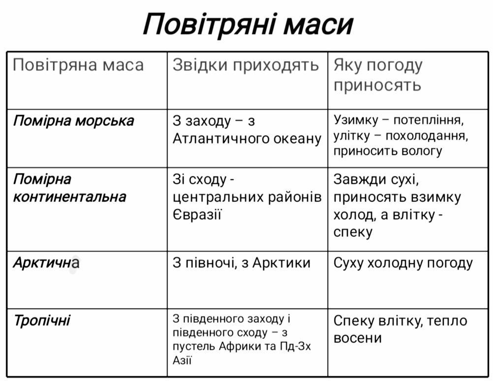 Табл. "Типи повітряних мас, що впливають на формування клімату України"