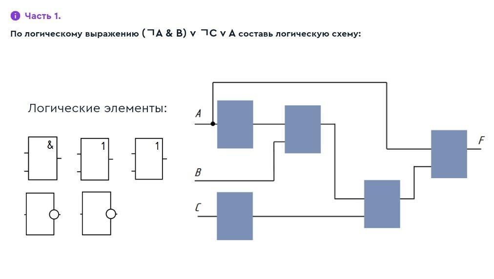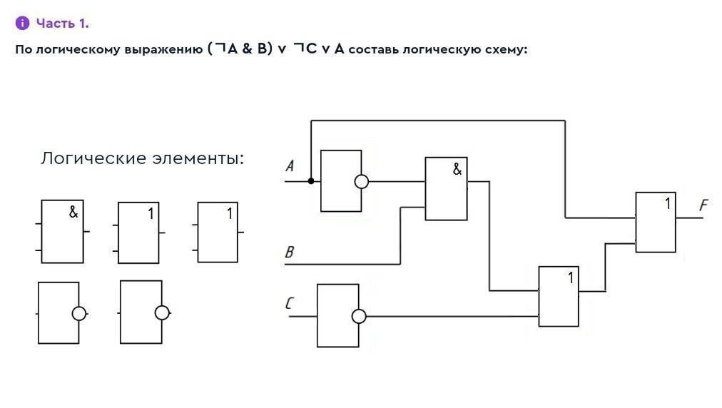 1 Часть 1. По логическому выражению (7А & B) v TCV А составь логическую схему: Логические элементы: & 1 A B С F