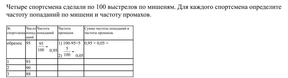 Четыре спортсмена сделали по 100 выстрелов по мишеням. Для каждого спортсмена определите частоту попаданий по мишени и частоту промахов. No Частота Число Частота спортсмена попадпопаданий промахов аний образец 195 95 100 1 2 3 93 90 88 0.95 Сумма частоты попаданий и частоты промахов. 1) 100-95-5 0,95 + 0,05 = 5 2) 100 0,05