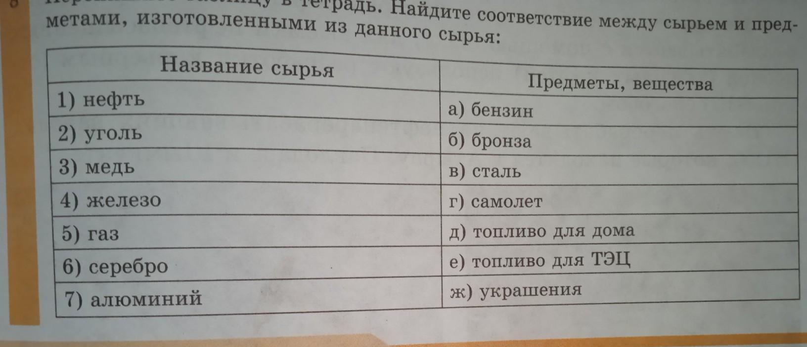 8 Перепишите таблицу в тетрадь. Найдите соответствие между сырьем и пред- метами, изготовленными из данного сырья: Название сырья Предметы, вещества 1) нефть 2) уголь 3) медь 4) железо 5) газ 6) серебро 7) алюминий a) бензин б) бронза в) сталь г) самолет Д) Топливо для дома e) топливо для ТЭЦ ж) украшения