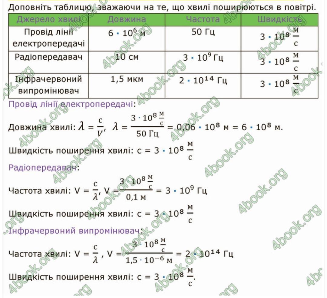 2. Доповніть таблицю, вважаючи, що хвилі поширюються в повітрі. Джерело хвилi Провід лінії електропередачі Радіопередавач Інфрачервоний випромінювач Довжина Частота 50 Гц 10 см 1,5 мкм Швидкість
