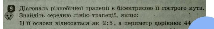 Объяснение:1) Для знаходження середньої лінії трапеції (медіани), використаємо властивість рівнобічної трапеції, що діагональ, що є бісектрисою гострого кута, розділяє медіану на дві рівні частини.