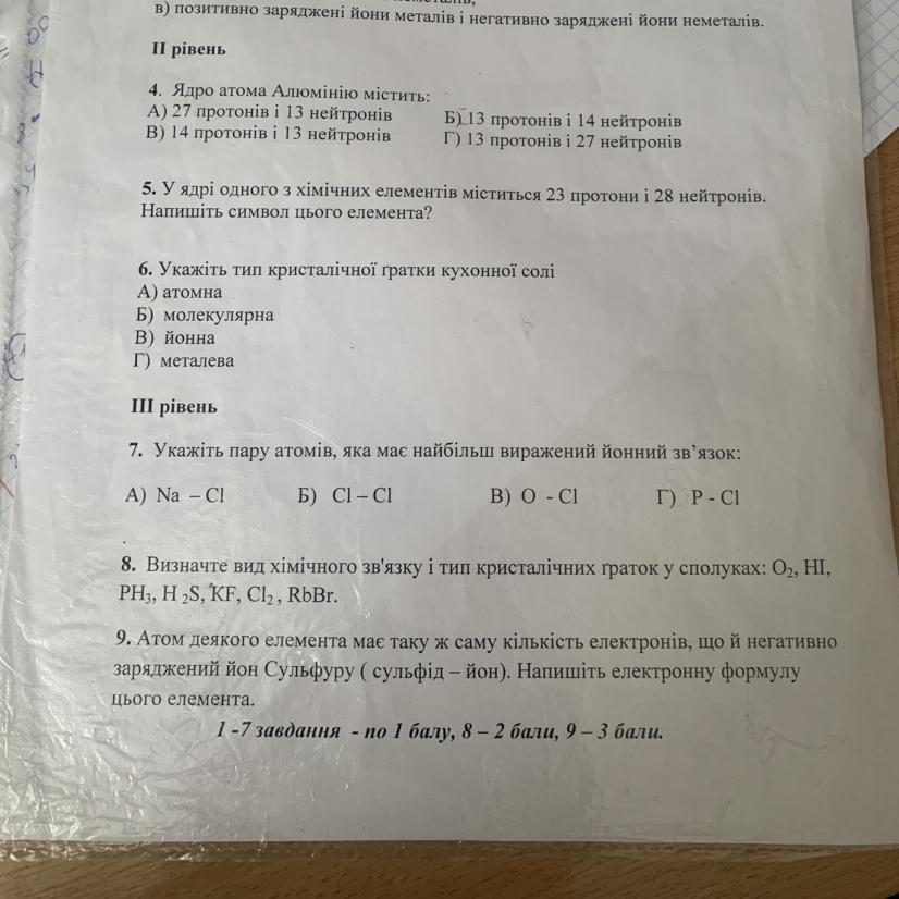 Отже, види хімічних зв'язків у наведених сполуках можуть бути молекулярними ковалентними зв'язками або іонними зв'язками, а тип кристалічних ґраток - молекулярні або йонні.