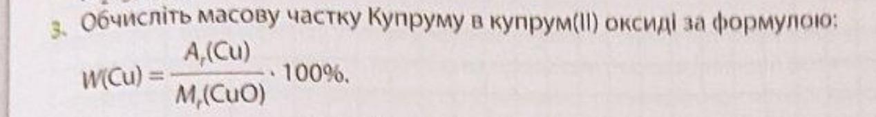 W(Cu) = Ar(Cu)/Mr(CuO) *100% = 64/80 *100% = *скорочуємо на 64 та 80 на 16* = 4/5 * 100% = 0,8 * 100% = 80%