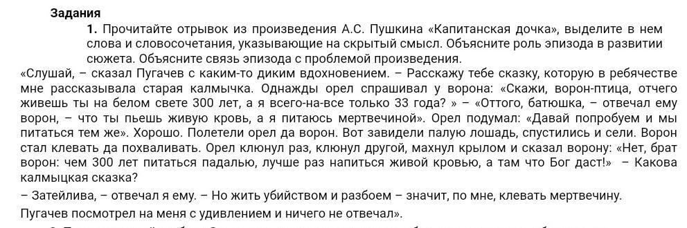 Задания 1. Прочитайте отрывок из произведения А.С. Пушкина «Капитанская дочка», выделите в нем слова и словосочетания, указывающие на скрытый смысл. Объясните роль эпизода в развитии сюжета. Объясните связь эпизода с проблемой произведения. > - помогите ставлю 20 баллов