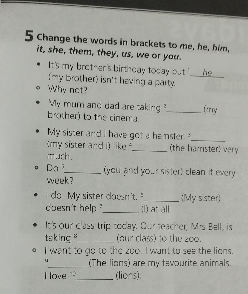 Change the words in brackets to me, he, him, it, she, them, they, us, we or you. • It's my brother's birthday today but ¹ he (my brother) isn't having a party. Why not? • My mum and dad are taking 2 brother) to the cinema. . My sister and I have got a hamster. 3. (my sister and I) like 4. much. o Do 5 O week? (the hamster) very (you and your sister) clean it every I do. My sister doesn't. 6. doesn't help 7 (my (1) at all. (My sister) It's our class trip today. Our teacher, Mrs Bell, is taking 8 (our class) to the zoo. 9 I want to go to the zoo. I want to see the lions. (The lions) are my favourite animals. (lions). I love 10