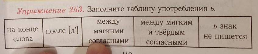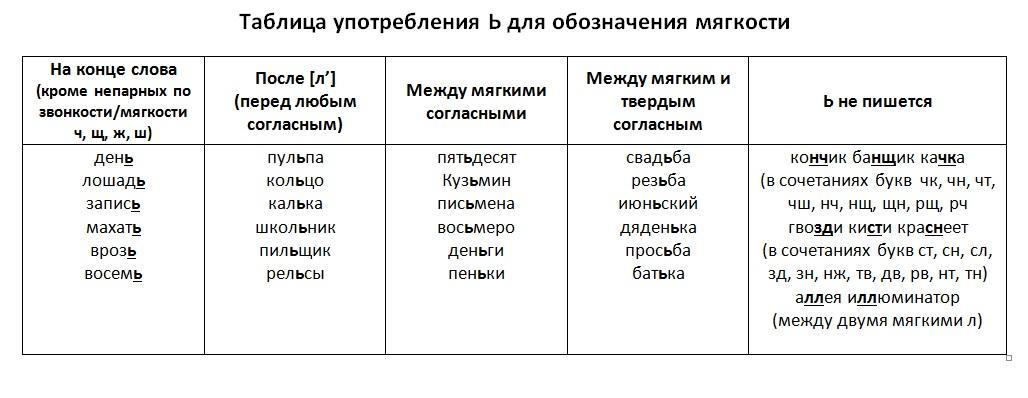 Заполненная таблица дана в приложении, в ней указаны случаи употребления Ь для обозначения мягкости согласных и варианты его отсутствия.