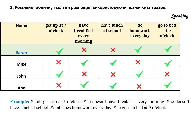 Анна прокидається о 7:00 щодня. Вона не завжди їсть сніданок, але завжди робить домашнє завдання. Вона не їсть обід у школі, тому зазвичай приносить із собою їжу. Анна лягає спати о 21:00.