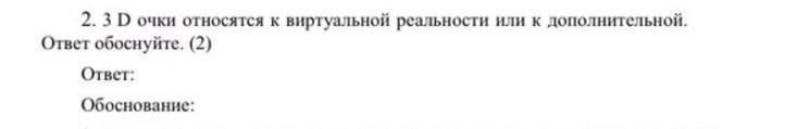 Дам 25 балоов. Ответь на русском языкк. 2. 3 D очки относятся к виртуальной реальности или к дополнительной. Ответ обоснуйте. (2) Ответ: Обоснование: