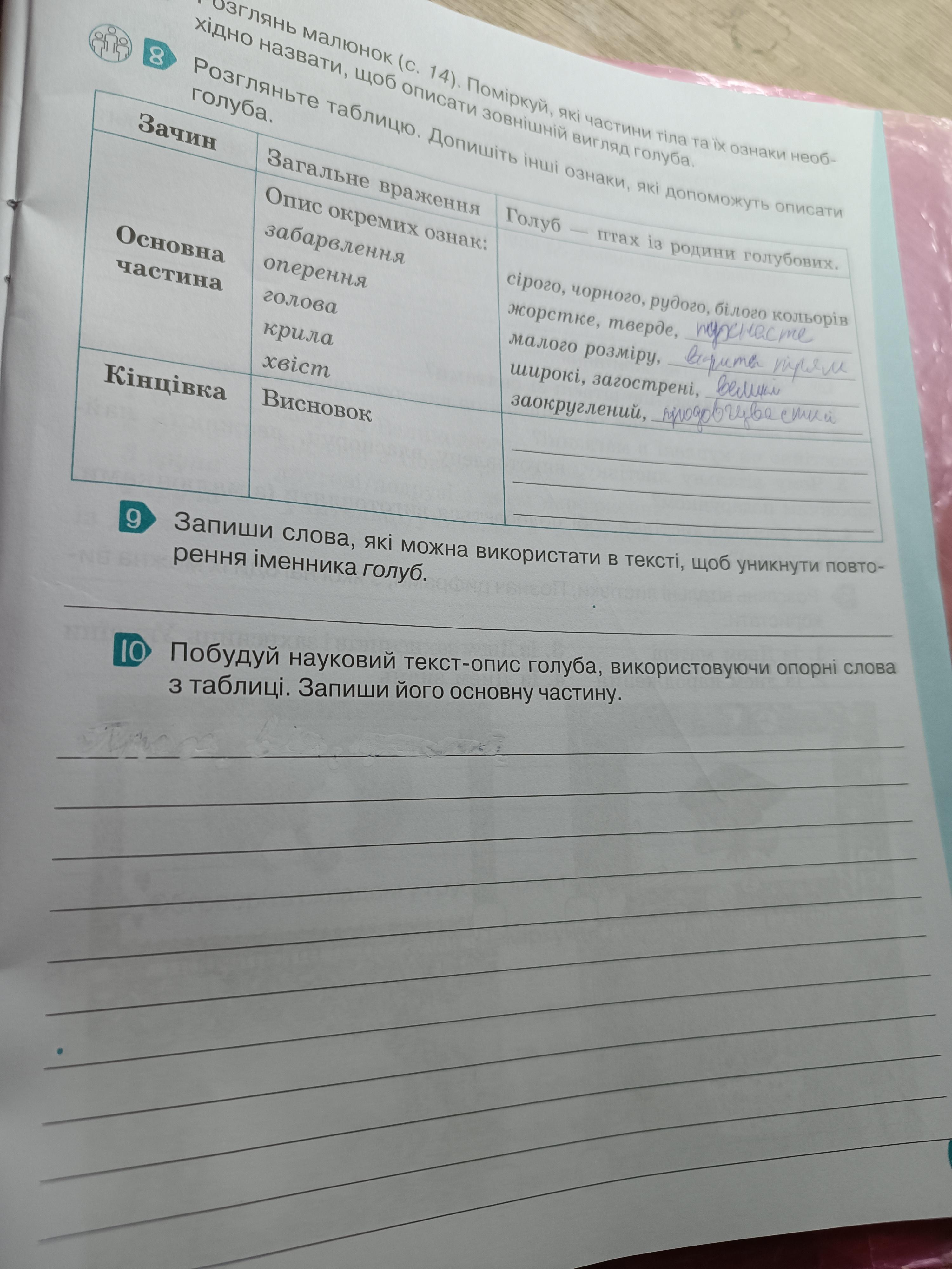 9 Запиши слова, які можна використати в тексті, щоб уникнути повторення іменника голуб.