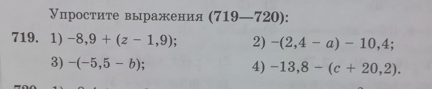 Упростите выражения 719. 1) -8,9 + (z - 1,9); 2)-(2,4-а)-10,4 3)-(-5,5 - b) 4)-13,8-(c+20,2)