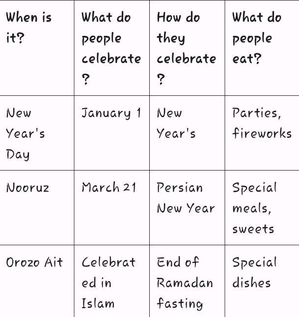2. a) Listen or read. Complete the table. When is it? New Year's Day January 1 Nooruz Orozo Ait k