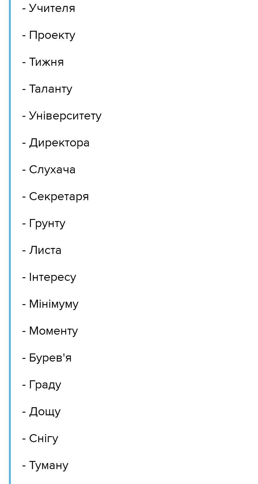 Учитель, проєкт, тиждень, талант, університет, директор, слухач, секретар, грунт, лист, інтерес, мінімум, момент, буревій, град, дощ, сніг, туман, ремонт, біль, запал.