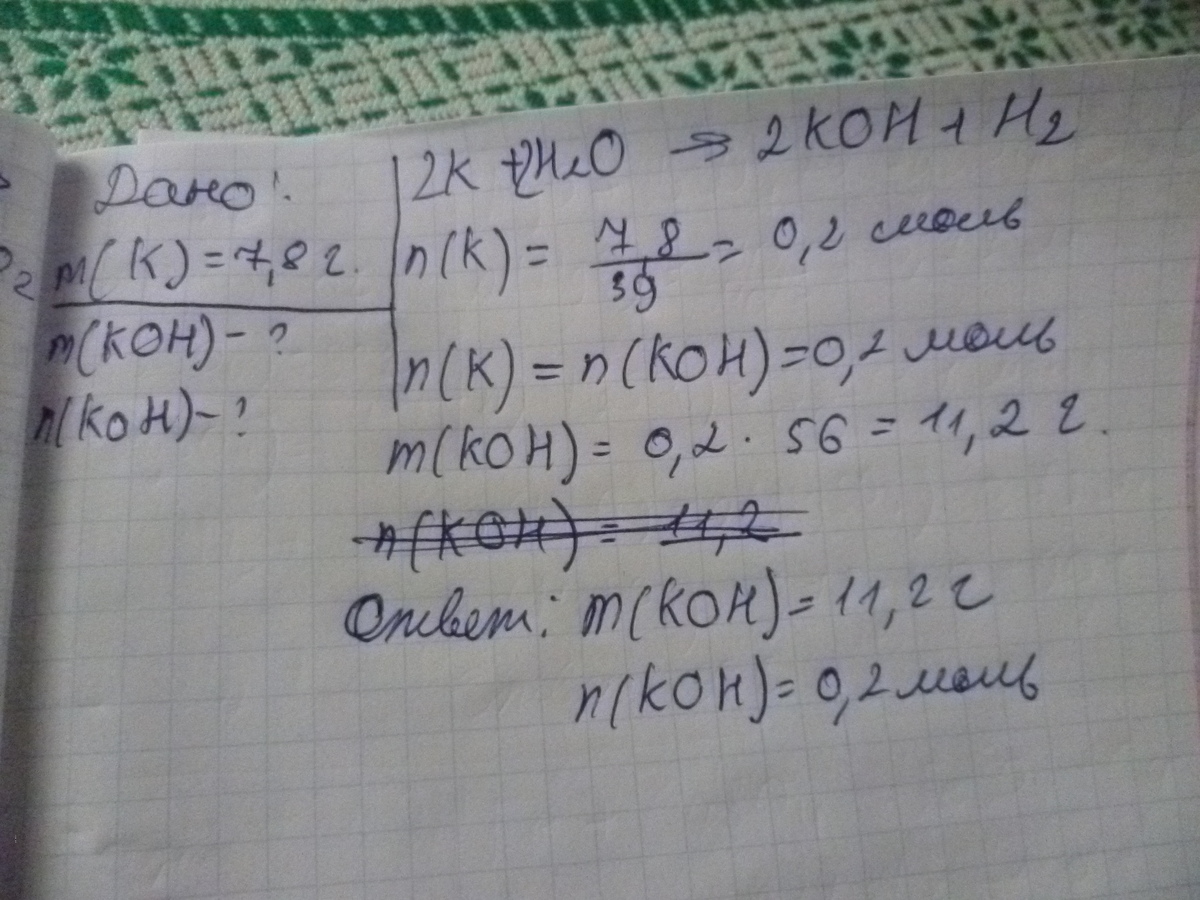вычислите массу гидроксида калия и количество вещества которое можно получить при полном взаимодействии с водой 7.8 грамм калия