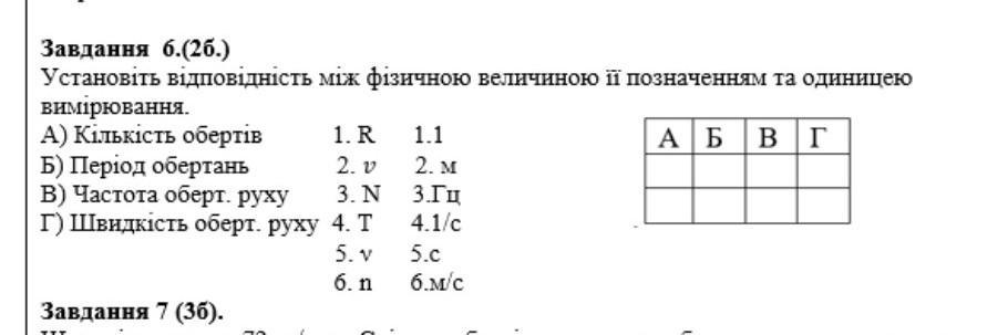 Завдання 6.(26.) Установіть вiдповiднiсть між фізичною величиною її позначенням та одиницею А Б В r вимірювання. А) Кількість обертів 1.R Б) Період обертань 2. v В) Частота оберт. руху 3. N Г) Швидкість оберт. руху 4. Т 5.v 6. п 1.1 2. M 3.Гц 4.1/c 5.c 6.м/с