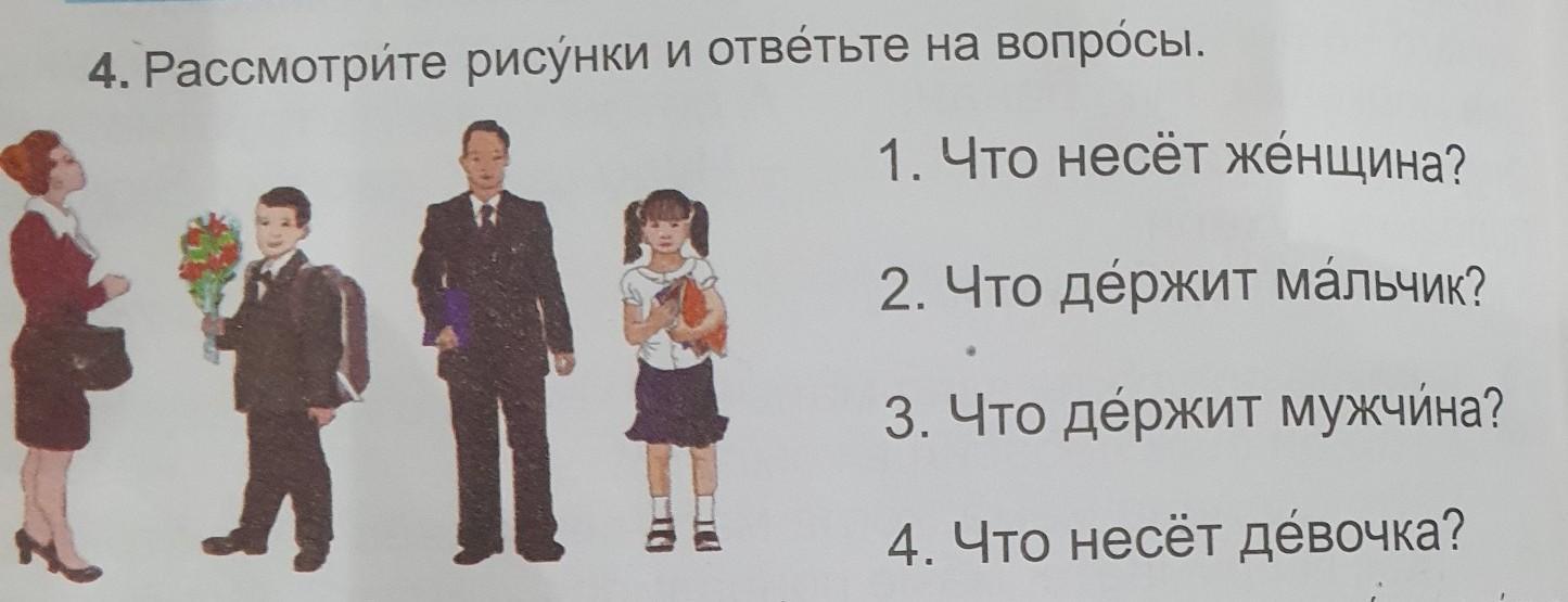 4. Рассмотрите рисунки и ответьте на вопросы. 1. Что несёт женщина? 2. Что держит мальчик? 3. Что держит мужчина? 4. Что несëт девочка?
