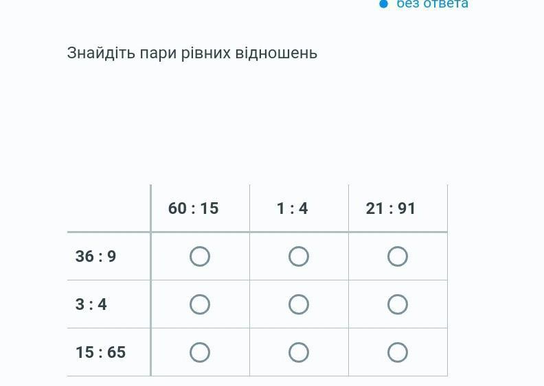 Знайдіть пари рівних відношень 36:9 3:4 15: 65 60: 15 O о о 1:4 о о • без ответа 21:91 о о