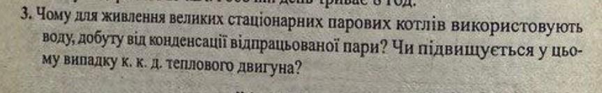3. Чому для живлення великих стаціонарних парових котлів використовують воду, добуту від конденсації відпрацьованої пари? Чи підвищується у цьо-му випадку к. к. д. теплового двигуна?