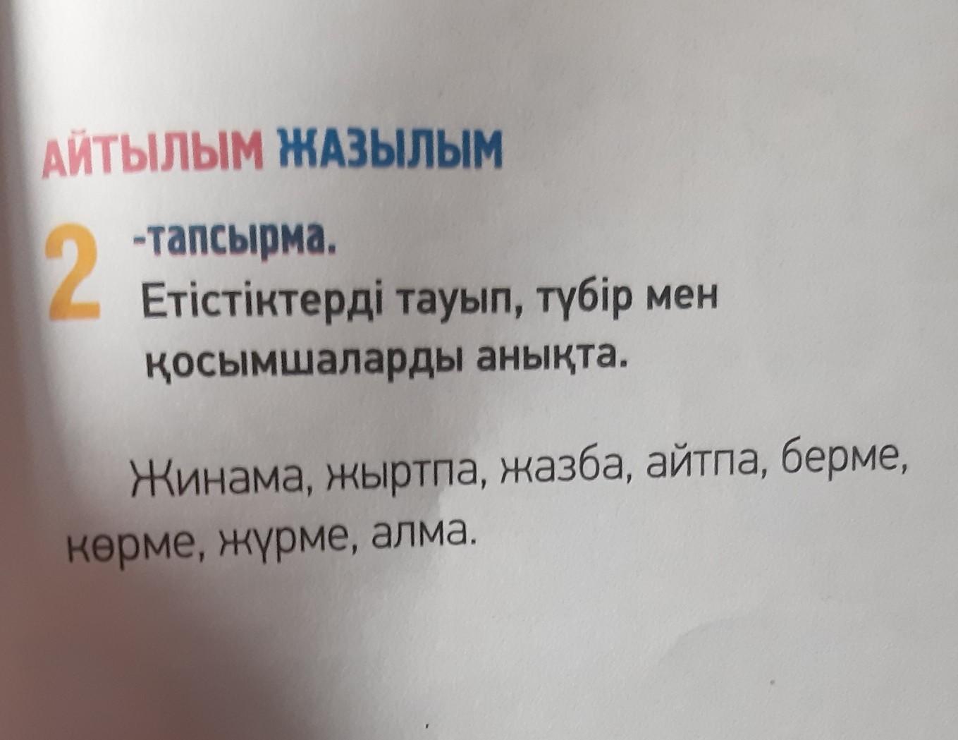 АЙТЫЛЫМ ЖАЗЫЛЫМ 2 -тапсырма. Етістіктерді тауып, түбір мен қосымшаларды анықта. Жинама, жыртпа, жазба, айтпа, берме, көрме, жүрме, алма.