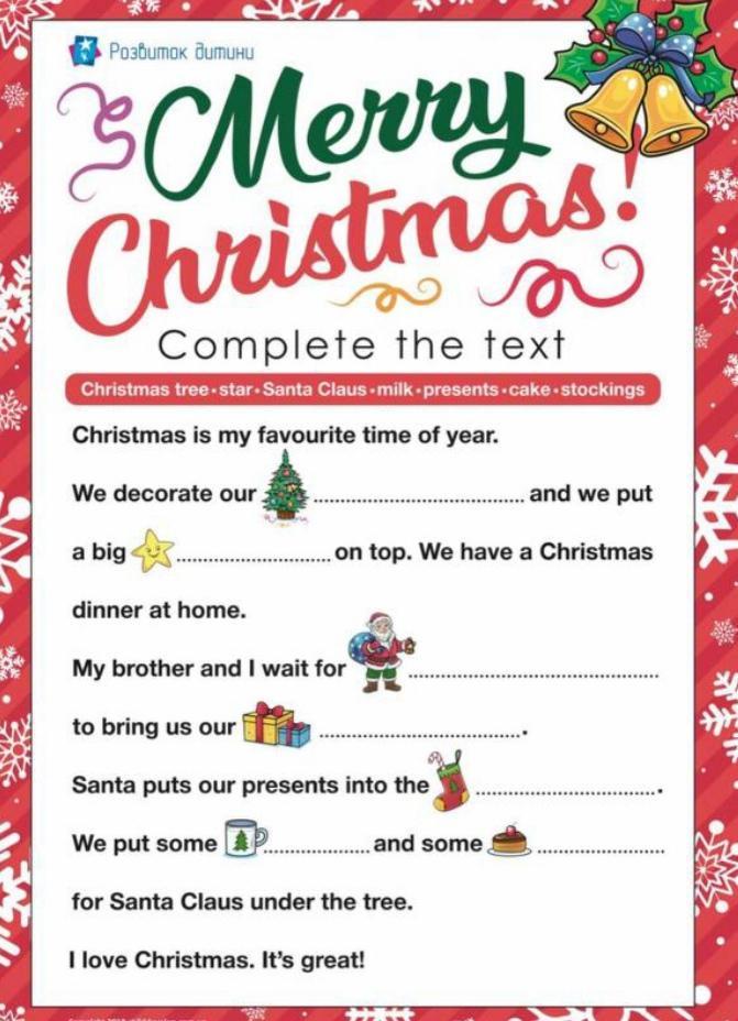 We decorate our Christmas tree and we put a big star on top. We have a Christmas dinner at home.