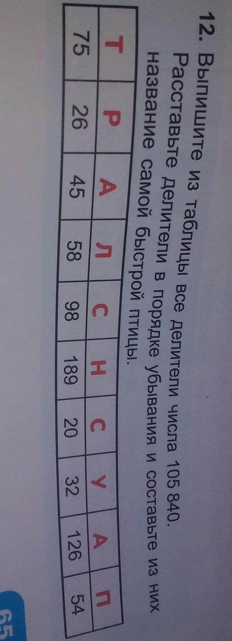 12. Выпишите из таблицы все делители числа 105 840. Расставьте делители в порядке убывания и составьте из них название самой быстрой птицы.