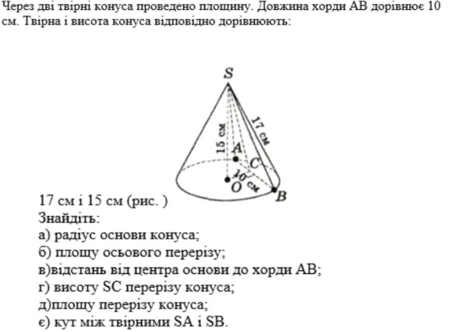 є) Кут між твірними SA і SB можна знайти за формулою: