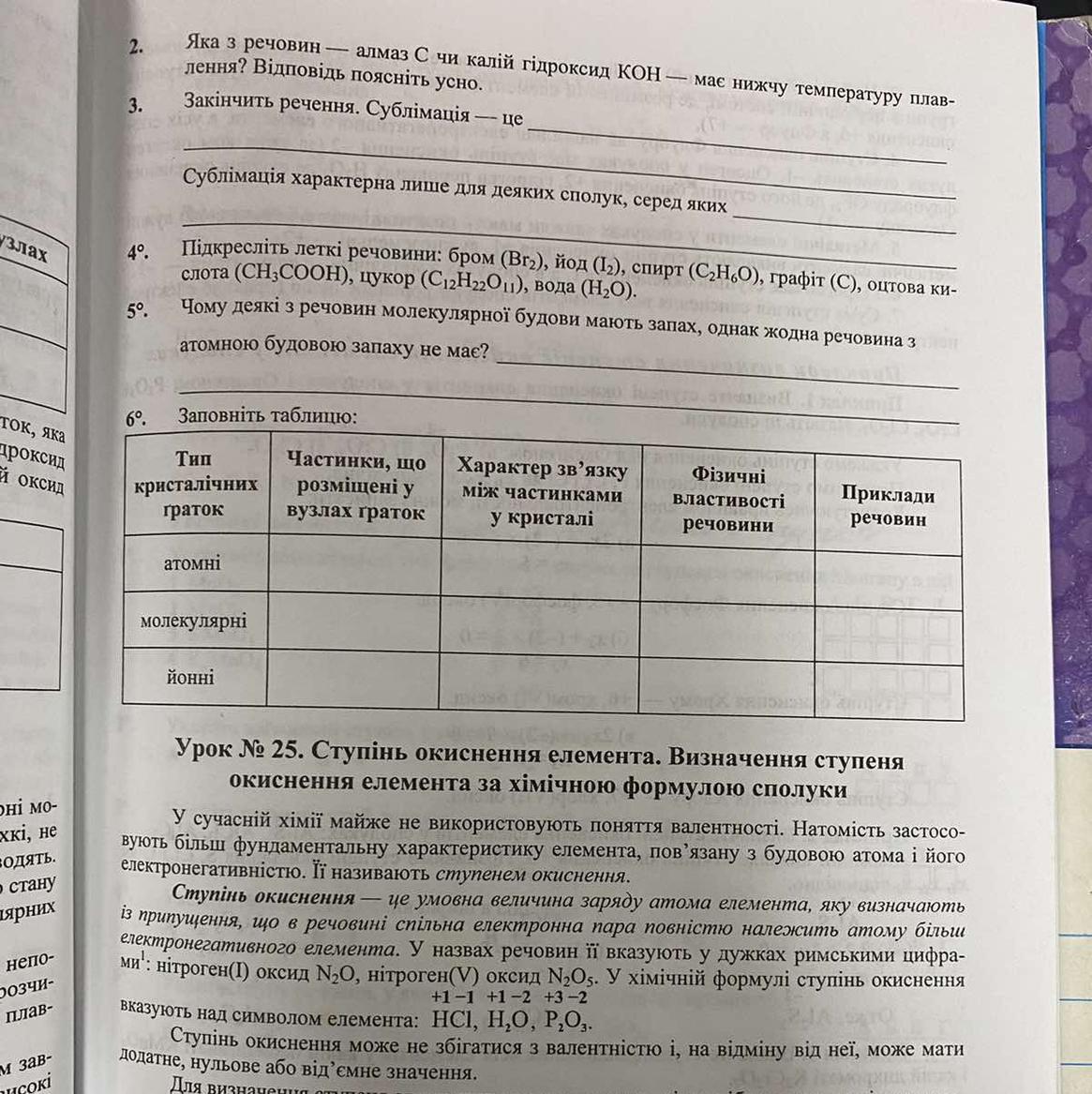 Приклади речовин 1 Бриліант, срібло, графен 2 Кристали цукру, вода (льод), кисню (газ) 3 Кухонна сіль (NaCl), магній сульфат (MgSO₄), кальцій карбонат (CaCO₃)