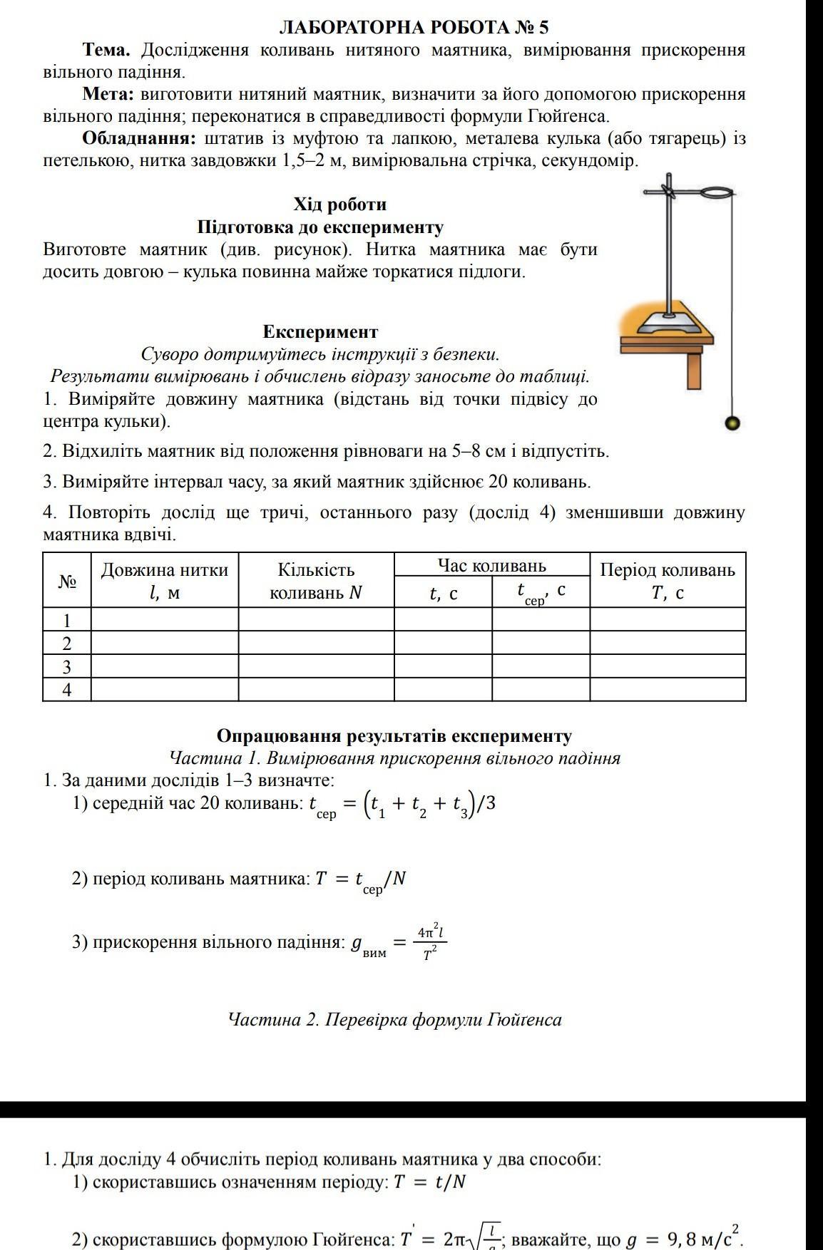 - Обчисліть середній час 20 коливань: \(t_{\text{сер}} = \frac{t_1 + t_2 + t_3}{3}\).