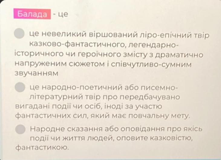 Балада - це невеликий віршований ліро-епічний твір казково-фантастичного, легендарно-історичного чи героїчного змісту з драматично напруженим сюжетом і співчутливо-сумним звучанням.