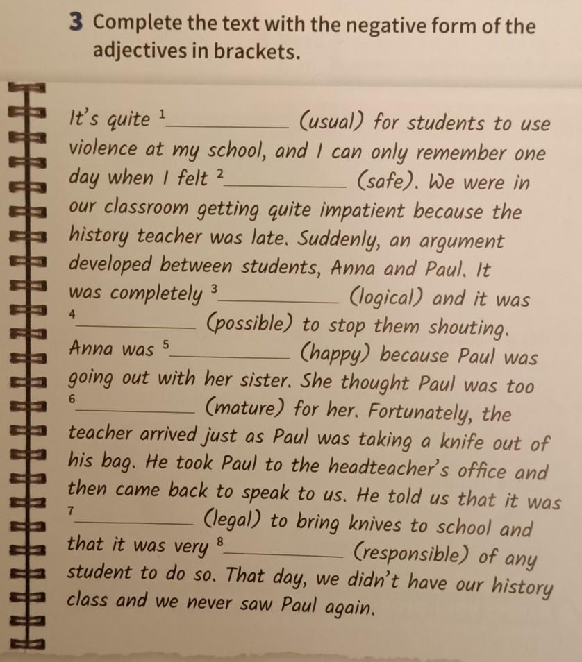 1 unusual 2 unsafe 3 illogical, 4 impossible 5 unhappy 6 immature 7 illegal 8 irresponsible..