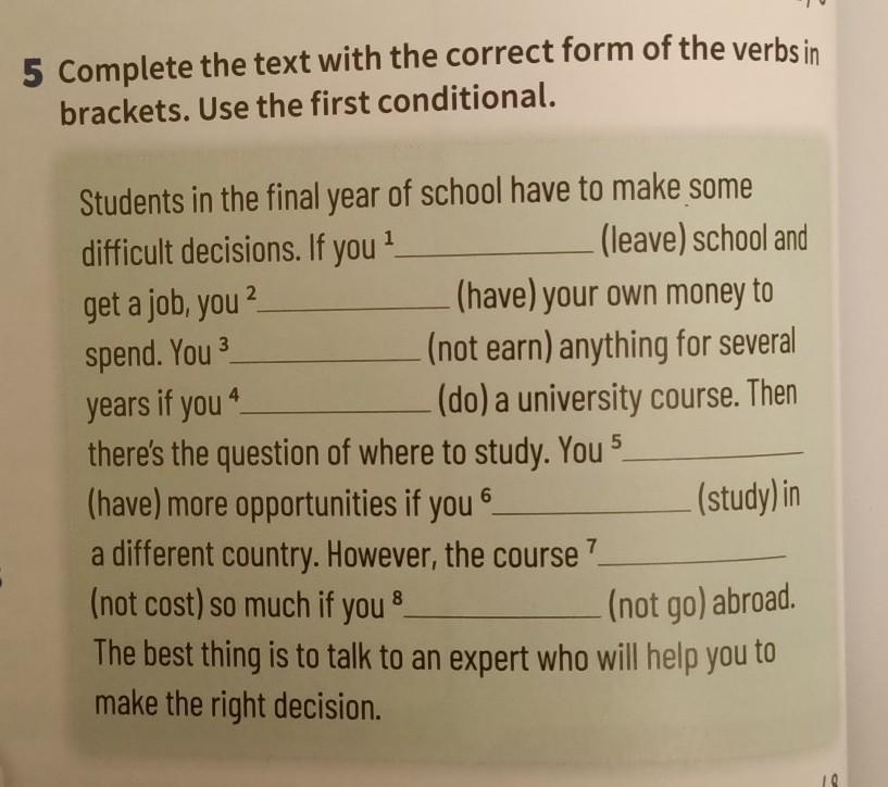 Students in the final year of school have to make some difficult decisions. If you leave (leave) school and get a job, you will have (have) your own money to spend. You won't earn (not earn) anything for several years if you do (do) a university course. Then there's the question of where to study. You will have (have) more opportunities if you study (study) in a different country. However, the course won't cost (not cost) so much if you don't go (not go) abroad. The best thing is to talk to an expert who will help you to make the right decision.