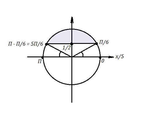 Решить тригонометрическое неравенство . Отмечаем на тригонометрическом круге значения синуса , большие 1/2 .