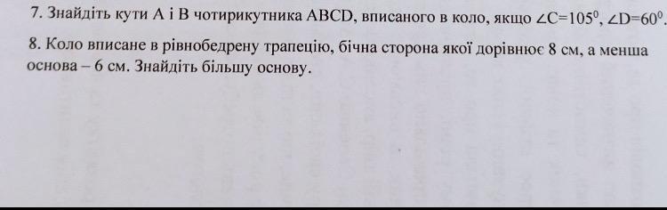 7. Знайдіть кути А і В чотирикутника ABCD, вписаного в коло, якщо ∠C=105°, ∠D=60°.