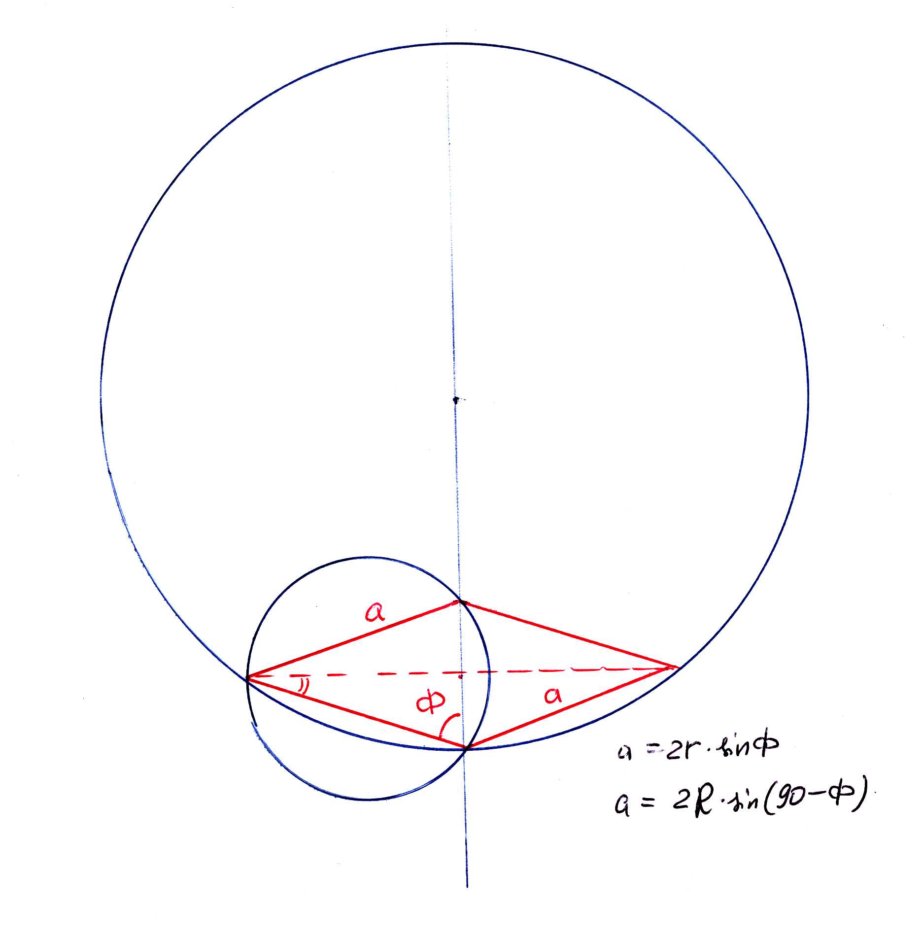 a = 2*r*sin(Ф); sin(Ф) = a/(2*r);