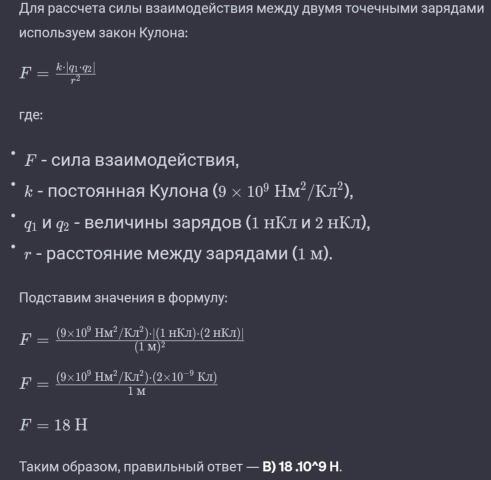 2.Рассчитайте, с какой силой взаимодействуют два точечных неподвижныхзаряда 1нКл и 2 нКл, находящихся на расстоянии 1м друг от друга в вакууме?