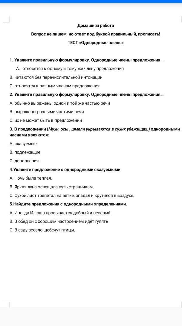 Домашняя работа Вопрос не пишем, но ответ под буквой правильный, прописать! ТЕСТ «Однородные члены» 1. Укажите правильную формулировку. Однородные члены предложения... А. ОТНОСЯТСЯ К одному и тому же члену предложения В. читаются без перечислительной интонации С. относятся к разным членам предложения 2. Укажите правильную формулировку. Однородные члены предложения... А. обычно выражены одной и той же частью речи В. Выражены разными частями речи С. их не может быть в предложении 3. В предложении (Мухи, осы, шмели укрываются в сухих убежищах.) однородными членами являются: А. сказуемые В. подлежащие С. дополнения 4. Укажите предложение с однородными сказуемыми А. Ночь была тёплая. В. Яркая луна освещала путь странникам. С. Сухой лист трепетал на ветке, опадал и крутился в воздухе. 5.Найдите предложения с однородными определениями. А. Иногда Илюша просыпается добрый и весёлый. В. В обед он с хорошим настроением идёт гулять С. В саду весело щебечут птицы.