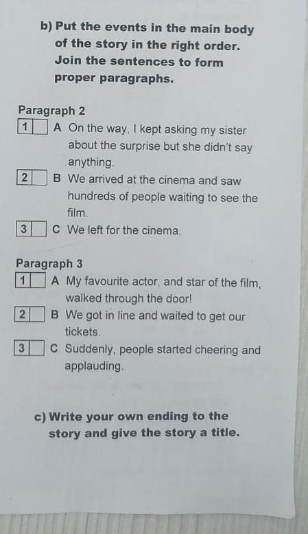 Paragraph 2 1 2 3 b) Put the events in the main body of the story in the right order. Join the sentences to form proper paragraphs. 2 3 A On the way, I kept asking my sister about the surprise but she didn't say anything. Paragraph 3 1 B We arrived at the cinema and saw hundreds of people waiting to see the film. C We left for the cinema. A My favourite actor, and star of the film, walked through the door! B We got in line and waited to get our tickets. C Suddenly, people started cheering and applauding.Пожалуйста помогите быстрей