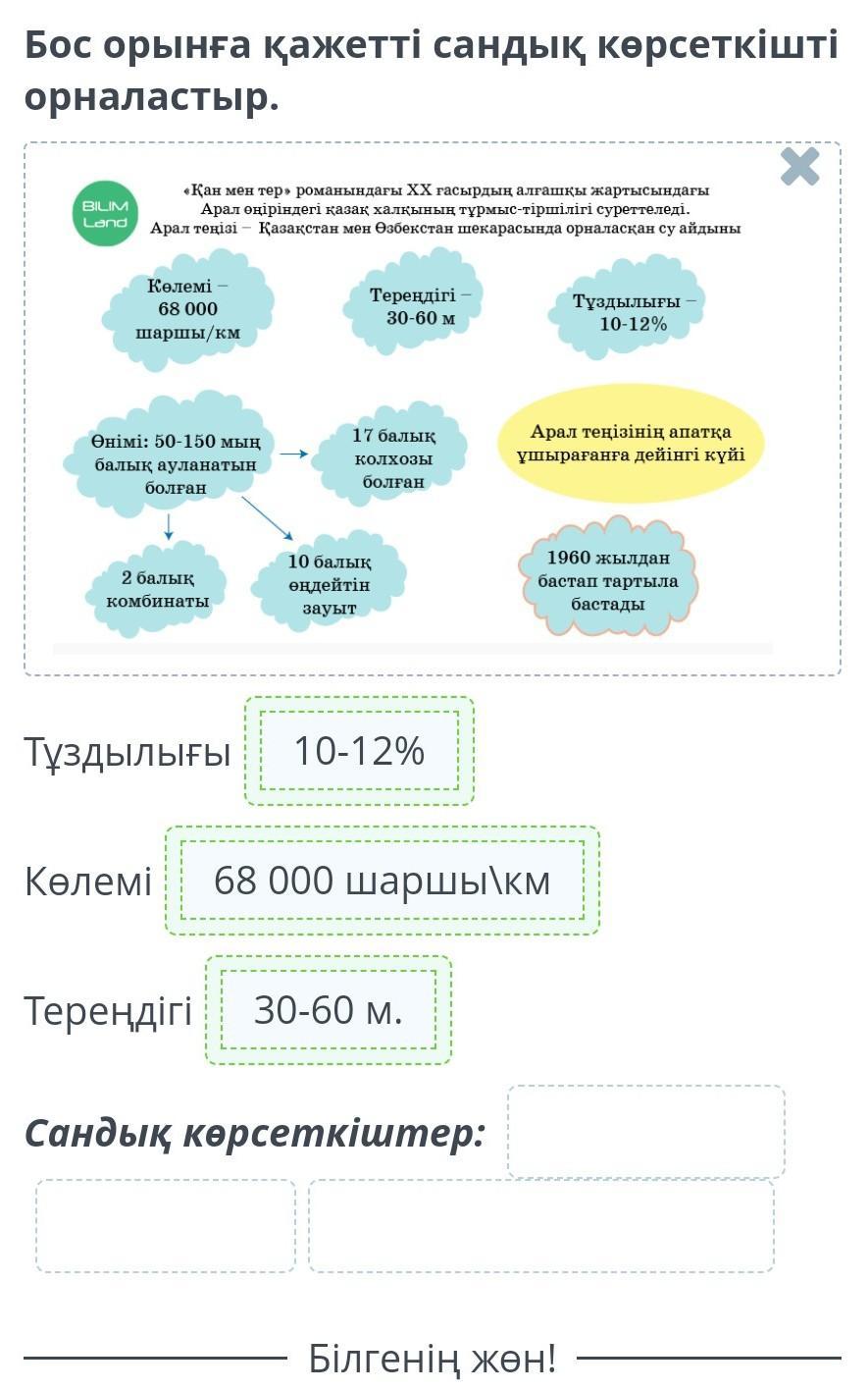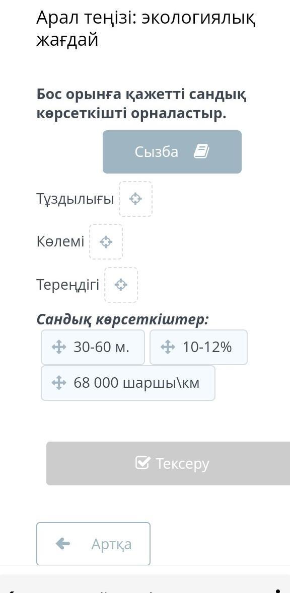 Арал теңiзi: ЭКОЛОГИЯЛЫҚ жағдай Бос орынға қажетті сандық көрсеткішті орналастыр. Тұздылығы Көлемі Сызба Тереңдігі Сандық көрсеткіштер: + 30-60 м. +10-12% * 68 000 шаршы\км