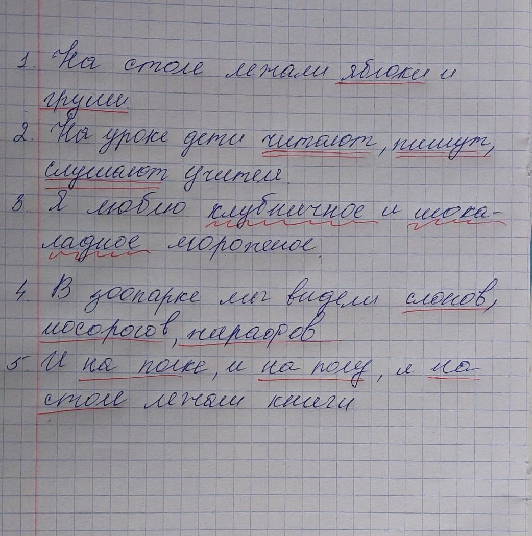 1.На столе лежали яблоки и груши.2. На уроке дети читают пишут слушают учителя.3. Я люблю клубничное и шоколадное мороженое.4. В зоопарке мы видели слонов носорогов жирафов.5. И на полке и на полу и на столе лежали книги.