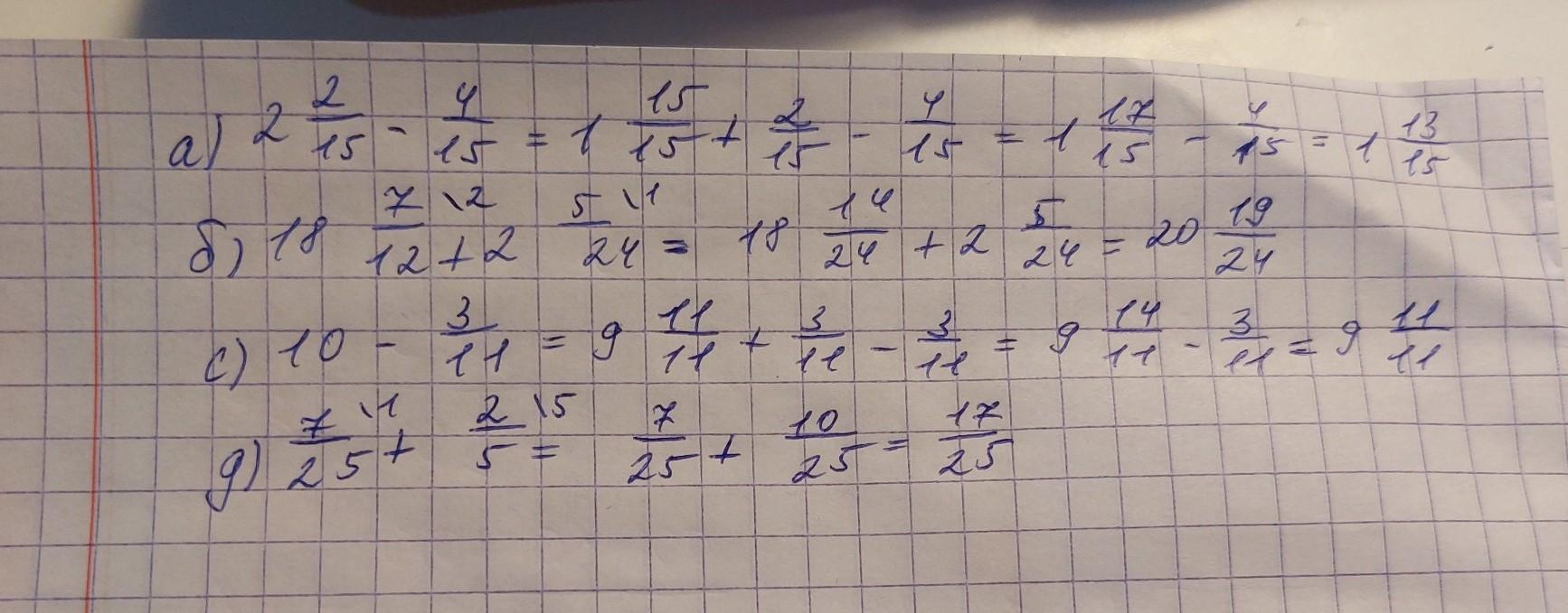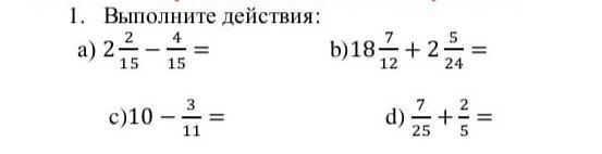 1. Выполните действия: 4 a) 223-15 2. с)10- Реш 3 11 5 b)1872 + 25 2 24 d) + 25 5 ||