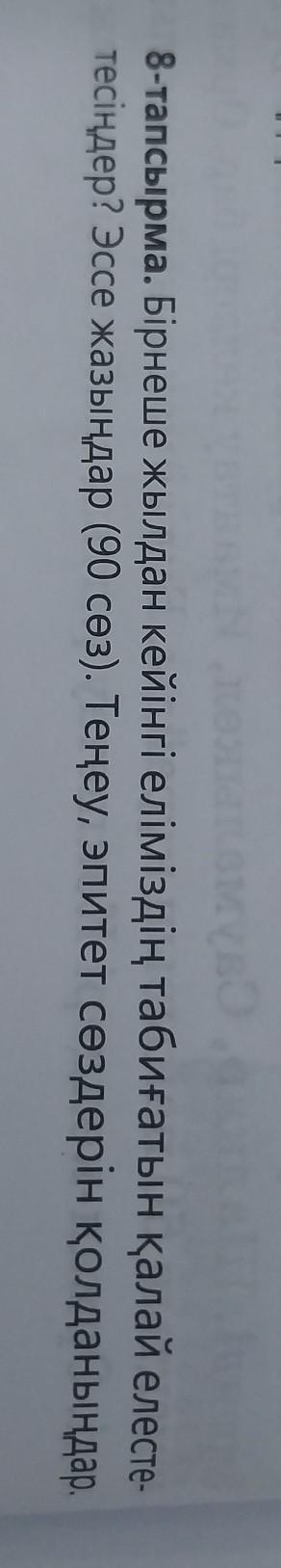 8-тапсырма. Бірнеше жылдан кейінгі еліміздің табиғатын калай елесте- тесiндер? Эссе жазыңдар (90 сөз). Теңеу, эпитет сөздерін қолданыңдар.