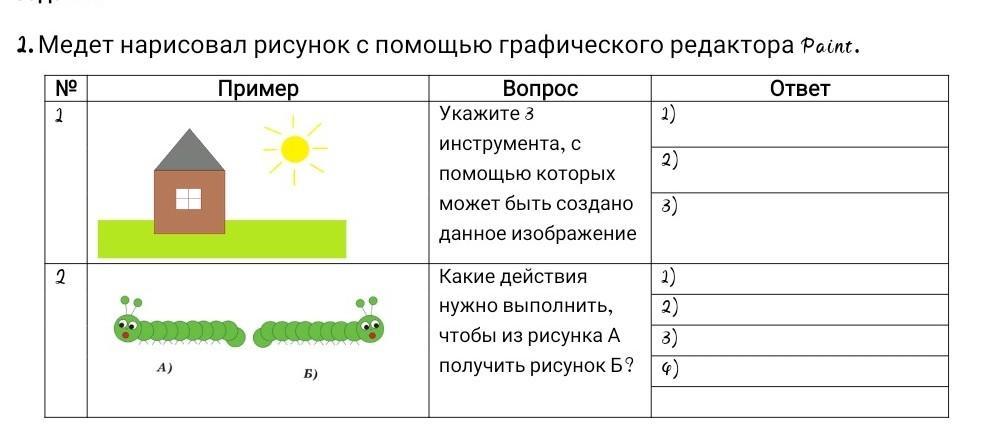 2. Медет нарисовал рисунок с помощью графического редактора Paint. Nº Пример Ответ 2 2 фии А) Б) Вопрос 2) инструмента, с 2) помощью которых может быть создано 3) данное изображение Укажите 3 Какие действия нужно выполнить, чтобы из рисунка А получить рисунок Б? 2) 2) 3)