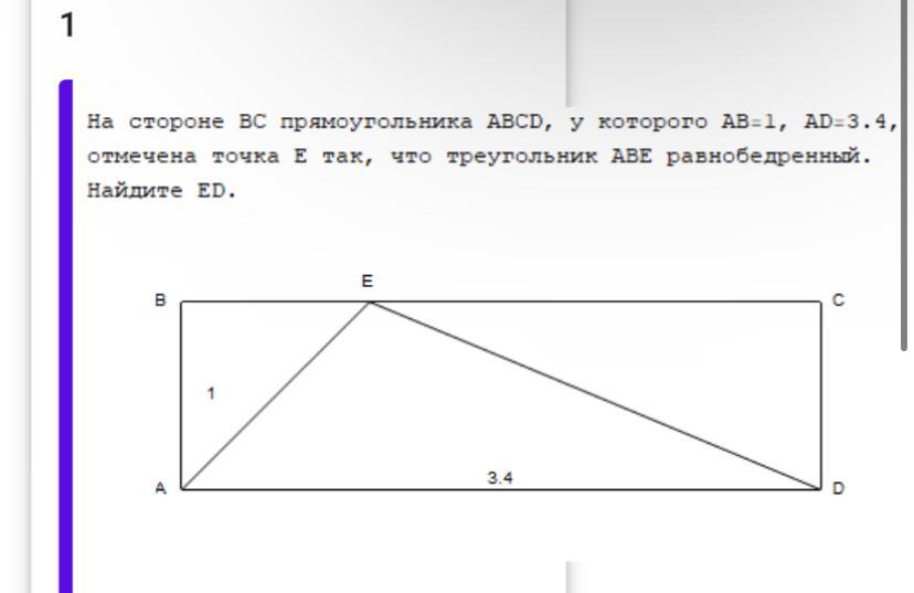 На стороне ВС прямоугольника ABCD, у которого AB=1, AD=3.4, отмечена точка Е так, что треугольник АВЕ равнобедренный.