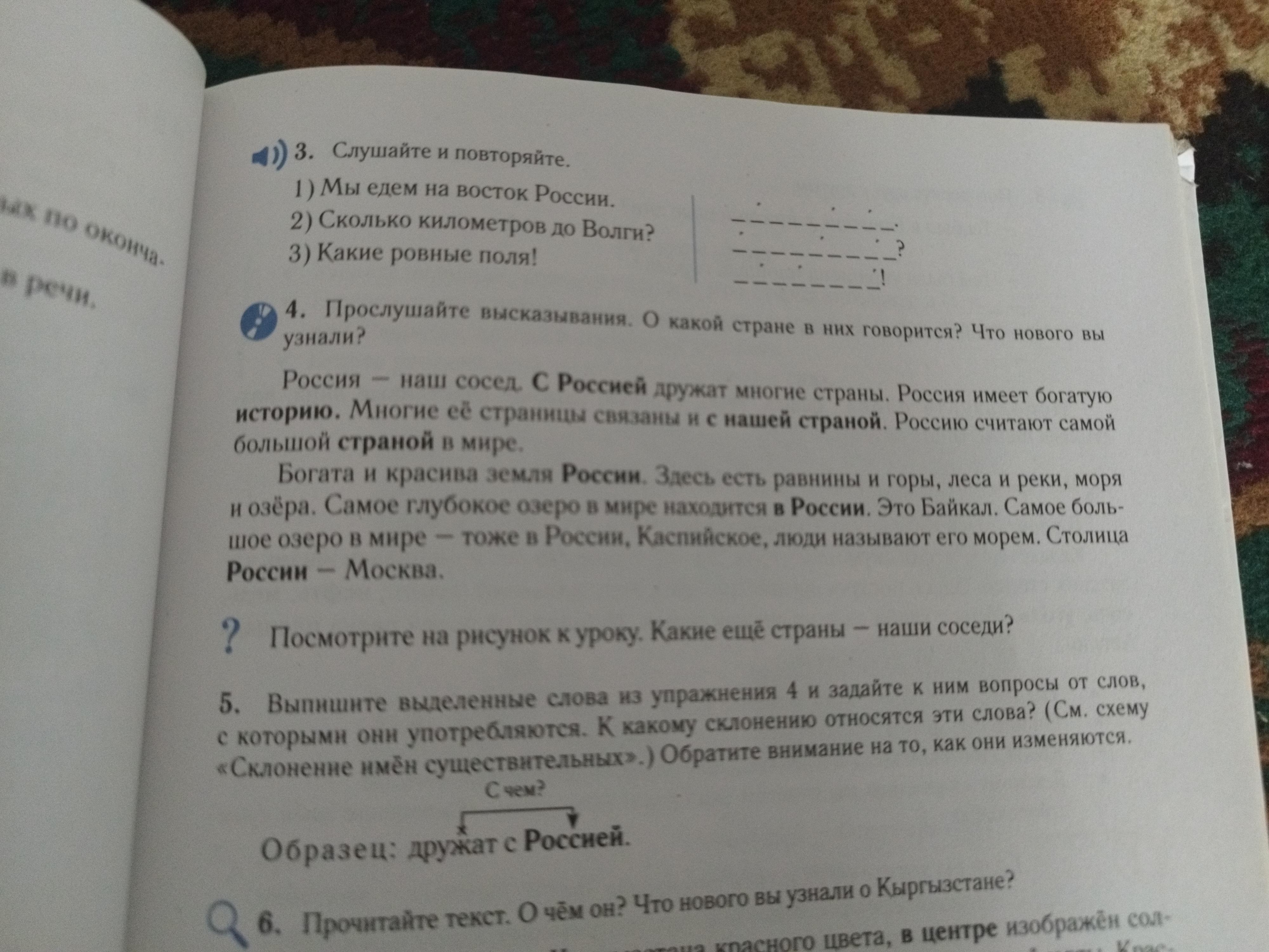 Выпишите выделенные слова из упражнения 4 и задайте к ним вопросы от слов, с которыми они употребляются. К какому склонению относятся эти слова? (См. схему «Склонение имен существительных».) Обратите внимание на то, как они изменяются. С чем? Образец: дружат с Россией.