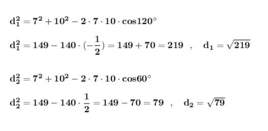Стороны параллелограмма равны 7 см и 10 см, а угол между ними равен 120°. Чему равны диагонали параллелограмма?