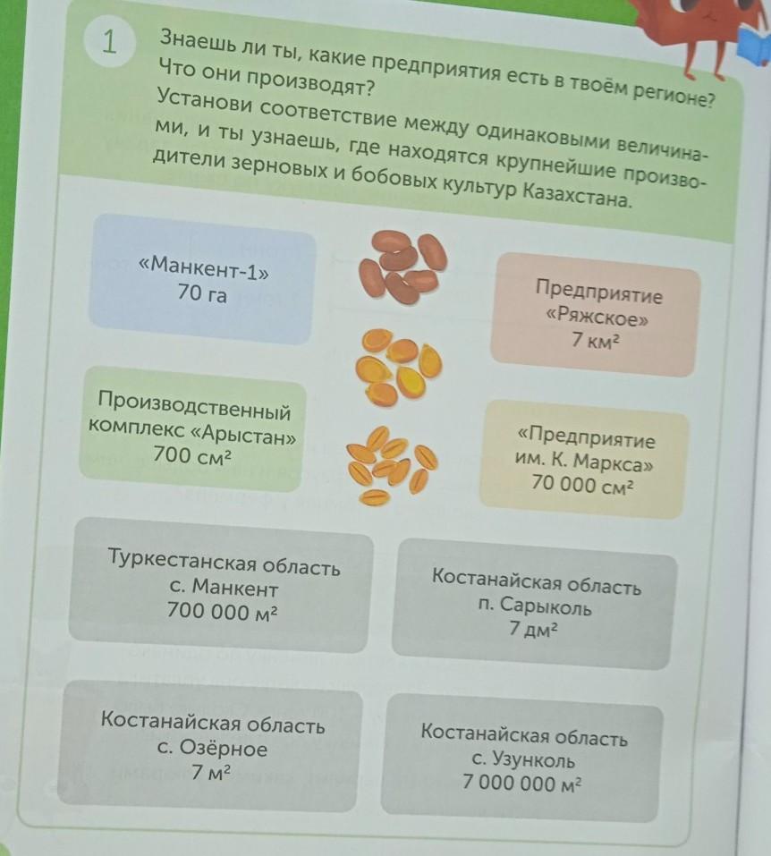 Знаешь ли ты , какие предприятия есть в твоём регионе? Что они производят ? Установи соответствие между одинаковыми величинами, и ты узнаешь , где находится крупнейшее производитель зерновых и бобовых культур Казахстана.