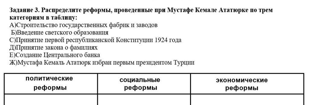 3. Распределите реформы, проведенные при Мустафе Кемале Ататюрке по трем категориям в таблицу: А)Строительство государственных фабрик и заводов Б)Введение светского образования С)Принятие первой республиканской Конституции 1924 года Д)Принятие закона о фамилиях Е)Создание Центрального банка