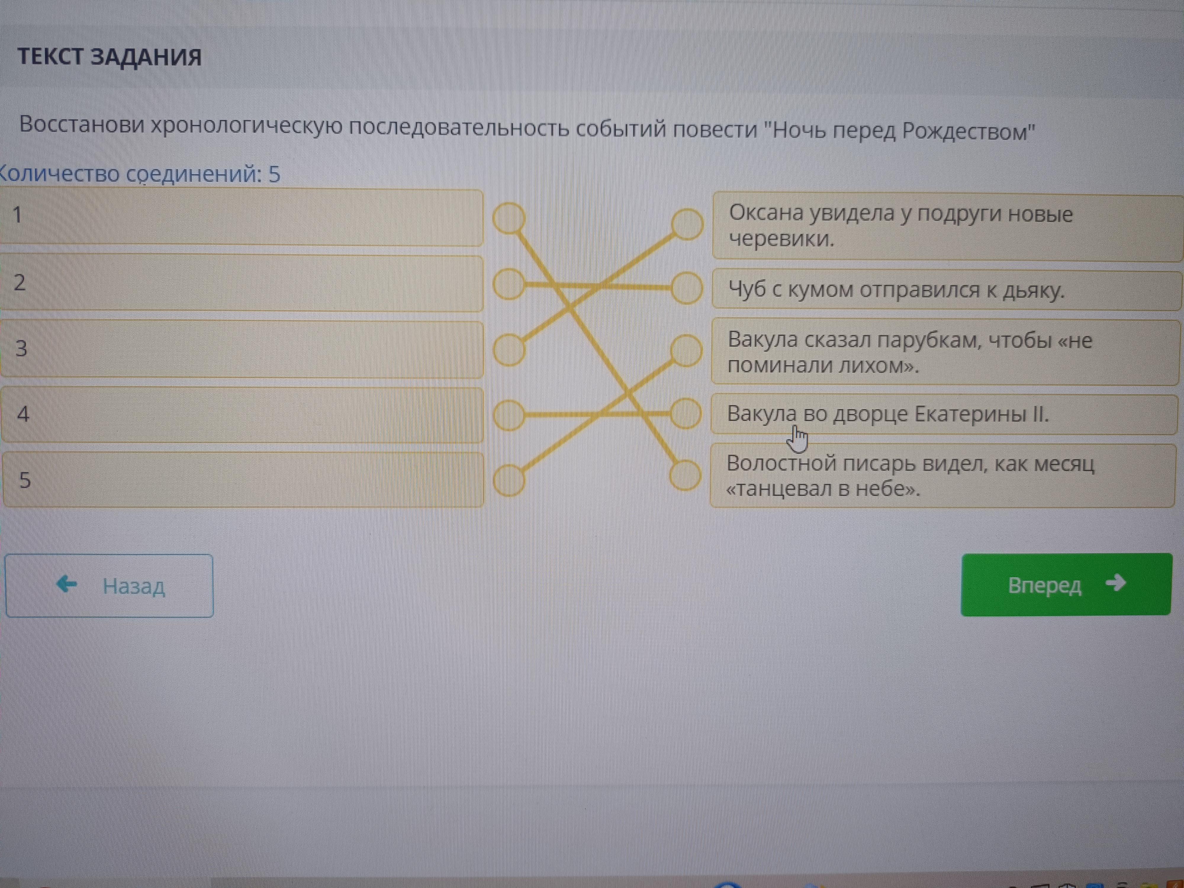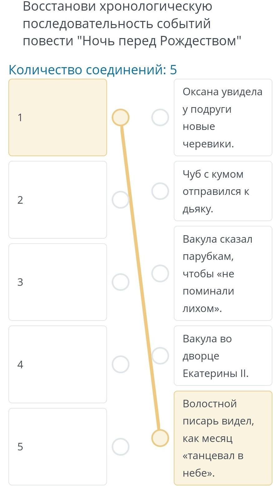 Восстанови хронологическую последовательность событий повести "Ночь перед Рождеством" Количество соединений: 5 1 2 3 4 5 Оксана увидела у подруги НОВЫЕ черевики. Чуб с кумом отправился к дьяку. Вакула сказал парубкам, чтобы «не поминали ЛИХОМ». Вакула во дворце Екатерины II. Волостной писарь видел, как месяц «танцевал в небе».