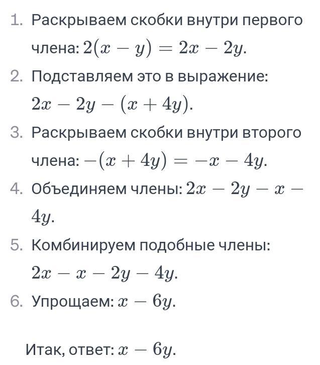 ные преобразования выражений. Тождество. Урок 1 Замени выражение тождественно равным, используя правило раскрытия скобок: 2(x - y) - (x – 4у). Ответ: