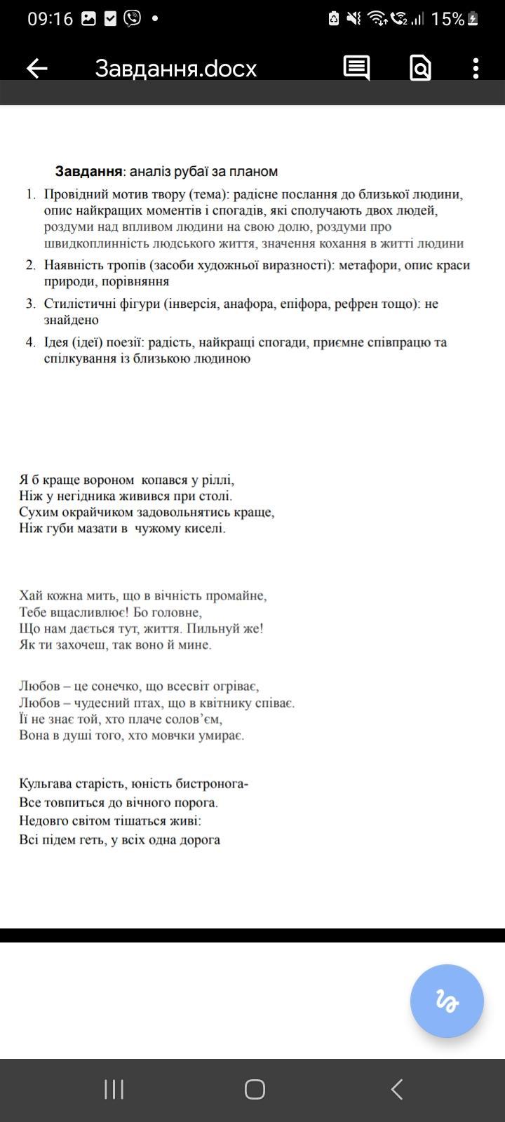 **4. Ідея (ідеї) поезії:** Основною ідеєю рубаїв є радість, приємні спогади та спілкування з близькою людиною. Вони також вражають думками про те, що життя коротке, і нам потрібно цінувати кожну мить щастя.